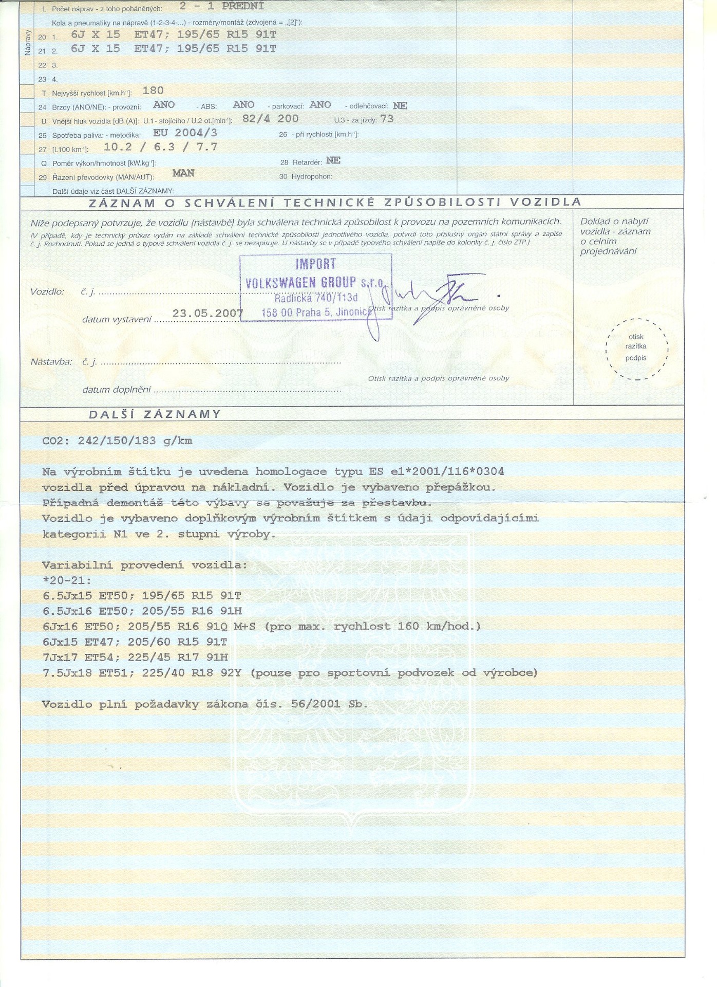 Parametry pneumatiky které smíme na vozidlo použít jsou uvedeny ve velkém technickém průkaze, zde na přiložené fotografii ukazují originální pneu řádek 20 a 21, níže ve spodní části "Další záznamy" jsou možné použitelné alternativy - někdy za připsaných podmínek.